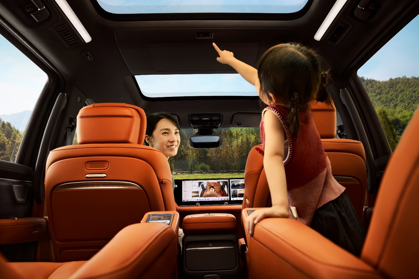 宽适空间之上,至境世家更以8屏空间生态互联,构建全家沉浸式娱乐厅。至境世家搭载高通最新SA8775P芯片,其高达72TOPS的AI算力为行业领先的8屏数字空间提供了强大支持。座舱内不仅有50吋全景AR-HUD抬头显示,还配备了10.25吋仪表屏、16.3吋中控屏、16.3吋副驾屏和21吋4K后舱多媒体智慧屏。屏幕均达到200PPI视网膜级细腻画质,并通过了莱茵TUV低蓝光护眼认证,呵护全家视力健康。后舱娱乐屏支持连接蓝牙麦克风和游戏手柄,配合Bose悦享音响系统,瞬间化身移动的KTV与游戏室。同级唯一的两个5.5吋智慧移动管家屏,则让二排乘客对舒适功能一屏掌控。此外,至境世家还配备二排OMS摄像头,支持手势控车和乘员实时检测,为宝宝睡眠或宠物留车等场景提供更贴心的呵护。AI大模型语音助手可控制超过700项车控功能,并提供情绪陪聊和AI绘画等服务,让移动的家更有温度。