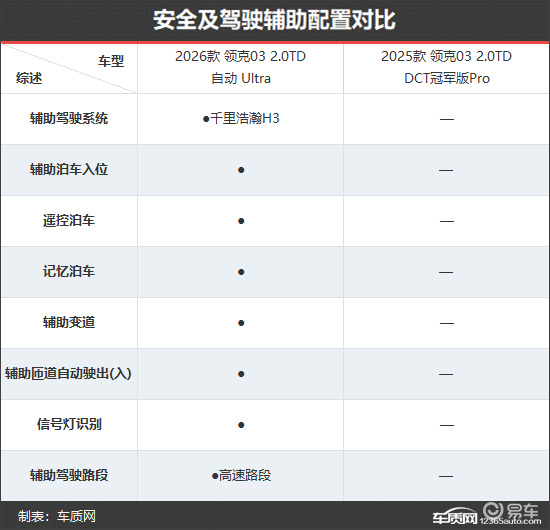 安全及驾驶辅助方面,新款领克03搭载高算力辅助驾驶芯片——地平线征程J6M,提供千里浩瀚辅助驾驶H3方案,可实现NOA高速领航驾驶辅助与全场景泊车。相比之下,老款车型配备基础版的L2级辅助驾驶,仅能实现全速自适应巡航跟车、车道保持辅助、车道居中保持等功能。