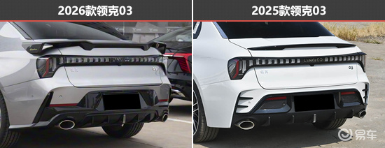新款领克03采用全新锋刃尾部造型设计,最直观的变化在于后包围更加简洁,后扰流板尺寸有所增大且角度进行细微调整,进一步优化空气动力学表现。除了上述变化外,新款领克03在车漆方面还新增了“极光银”配色可选。