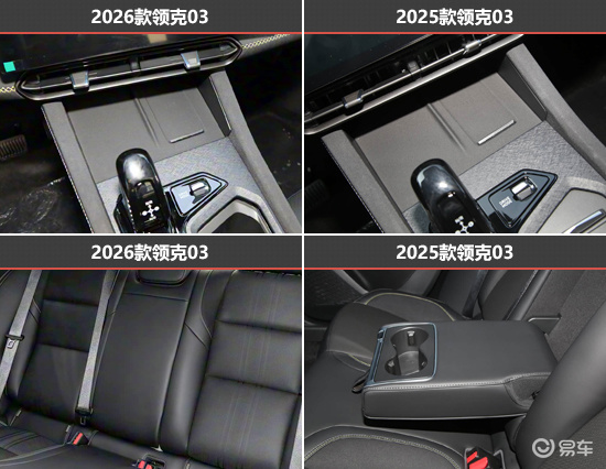 由于新老款领克03在宽度、高度和轴距方面均保持一致,并且座椅造型也基本没有变化,因此乘坐空间方面表现差异不大。储物空间方面,新款领克03也并未对车内前排布局进行改动,电子挡把前方配备双手机槽,右侧支持50W手机无线充电功能。中控台下方提供开放式储物格,方便放置较大尺寸的物品。至于后排,新款领克03取消了老款车型的后排中央扶手和杯架,考虑到其运动型车的定位,后排使用频率不高,这样的调整也在情理之中。