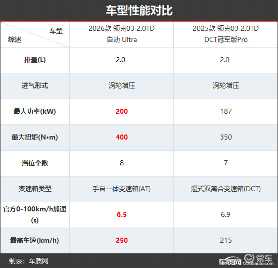 动力方面,新款领克03所搭载的2.0T发动机最大功率提升至200kW,峰值扭矩提升至400N·m,0-100km/h加速时间缩短至6.5s。传动系统方面,新款领克03的2.0T车型升级为爱信8AT变速箱,支持更大的扭矩输出。