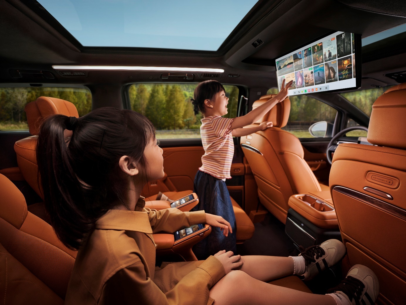 从数字化到数智化,至境世家采用高通最新的SA8775P芯片,拥有高达72TOPS的AI算力,并通过创新打造行业领先的8屏数字空间,为全家带来沉浸式智能娱乐体验。二排配备了同级唯一的双5.5吋智慧移动管家屏,可让后舱乘客对全车舒适和娱乐功能一屏掌控。