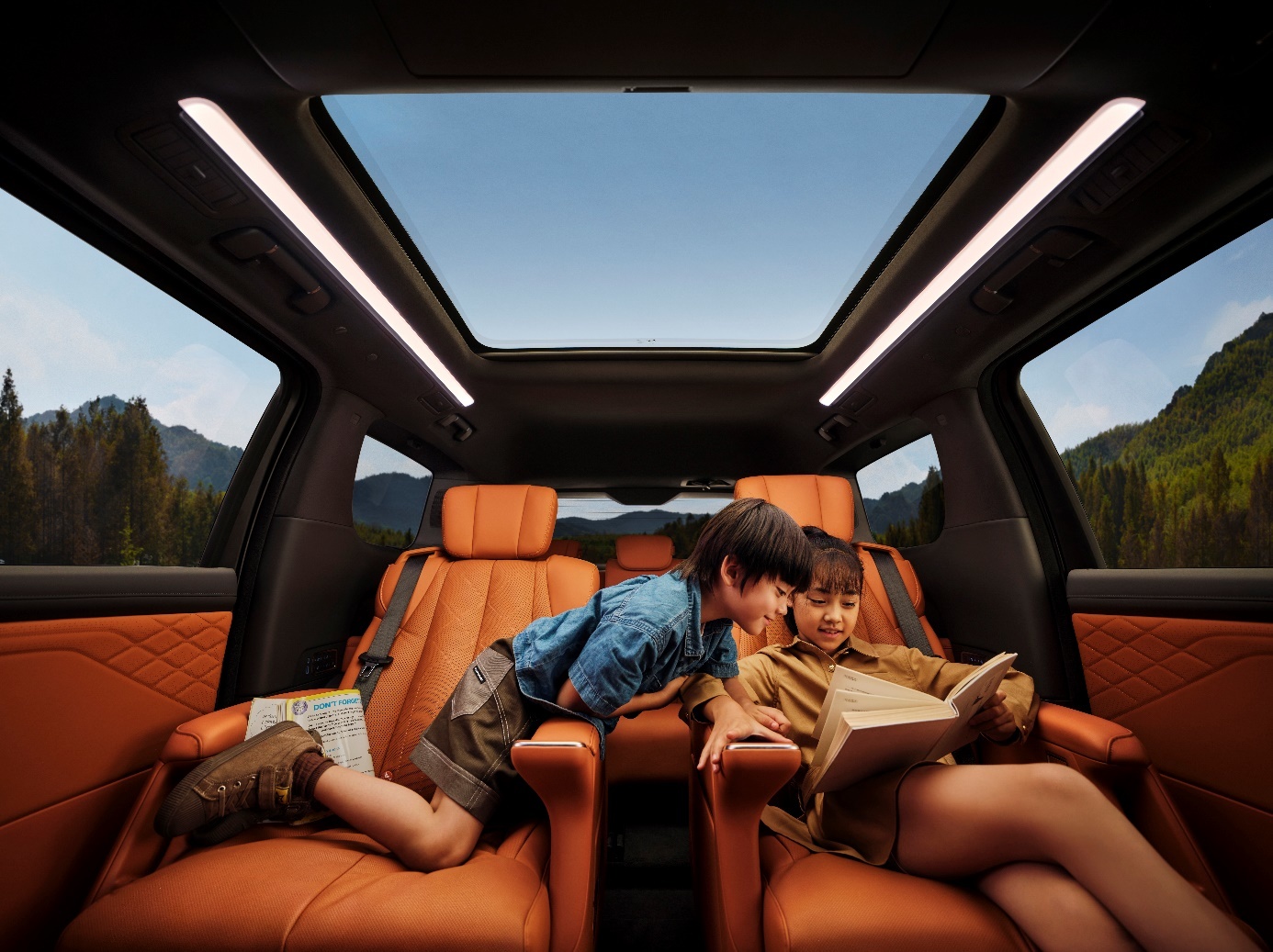至境世家搭载行业首个南德TÜV护眼认证智慧顶灯,1.1米的贯穿式灯带集成阅读灯和氛围灯功能,支持分段照明,可三级调节色温与亮度,还可一键切换“客厅”、“书房”、“卧室”三种主题光效,精准匹配休憩、阅读或睡眠等不同场景。境世家首次搭载的三屏贯通式娱乐屏(含10.25吋仪表、16.3吋中控屏及16.3吋副驾屏),以及21英寸4K高清后舱智慧屏,均获得莱茵TÜV护眼认证。