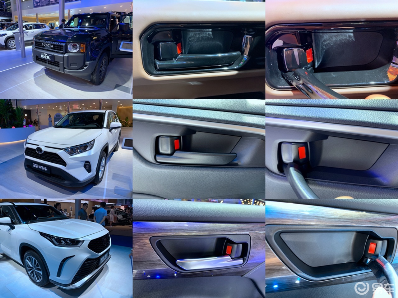 丰田普拉多、RAV4荣放、皇冠陆放,都是同样的内拉手配红标开关锁控制键。普拉多展示的探索版采用的是黑色漆面,皇冠陆放就是正常的镀铬亮面,而RAV4荣放就只是纯塑料了,让人能清晰的感受到车价的差异。