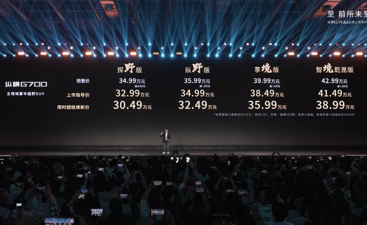 10月19日,纵横G700正式上市,售价为32.99-41.49万。这款具有划时代意义的全领域豪华越野SUV,以颠覆性姿态撕开高端越野市场的裂缝。