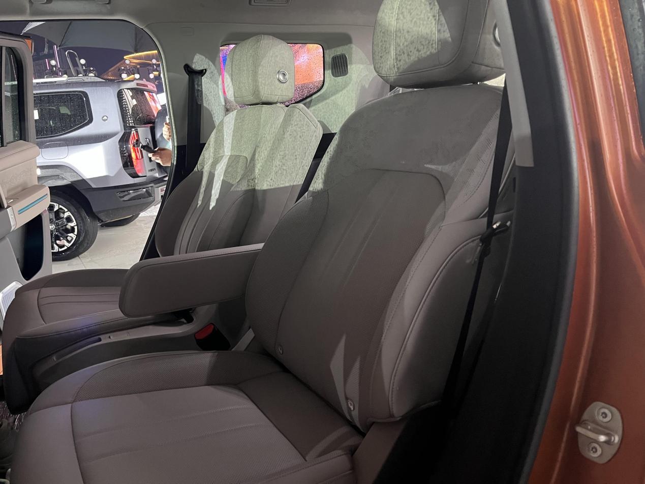 一打开车门,你就能感受到纵横G700的豪华感扑面而来,和硬派的越野外观有很大反差。很难想象,在这么“硬”的一台车上,内里有这么豪华的“装修”,其提供了五座布局和六座布局,空间都很大,不管车内纵向空间、空间得房率、二排腿部空间、三排腿部空间等等指标,都是同级第一或同级领先的水平,优势明显。